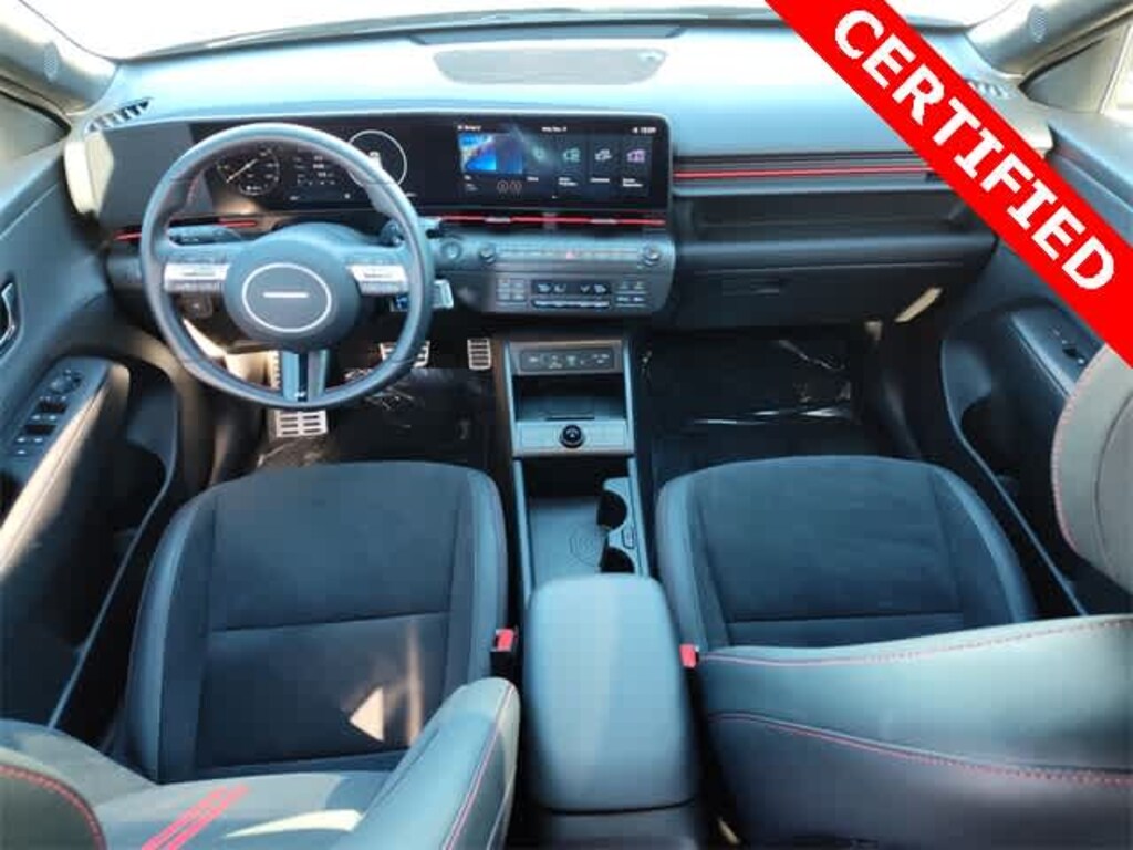 THIS VEHICLE ALSO IS EQUIPPED WITH THE FOLLOWING OPTIONS AND FEATURES: Option Group 01, Hyundai Certified Used Vehicles Certified, 4-Wheel Disc Brakes, 6 Speakers, ABS brakes, Air Conditioning, All Season Fitted Liners, Alloy wheels, AM/FM radio: SiriusXM, Apple CarPlay & Android Auto, Auto High-beam Headlights, Automatic temperature control, Brake assist, Bumpers: body-color, Cargo Net, Cargo Tray, Carpeted Floor Mats, Column-Mounted Shift-By-Wire, Delay-off headlights, Driver door bin, Driver vanity mirror, Dual front impact airbags, Dual front side impact airbags, Electronic Stability Control, Emergency communication system: Bluelink+, Exterior Parking Camera Rear, First Aid Kit, Four wheel independent suspension, Front anti-roll bar, Front Bucket Seats, Front Center Armrest, Front dual zone A/C, Front reading lights, Fully automatic headlights, Heated door mirrors, Heated front seats, Heated Front Sport Bucket Seats, Illuminated entry, Leather steering wheel, Low tire pressure warning, Mud Guards, N-Line Alcantara Sport Combination Seat Trim, Occupant sensing airbag, Outside temperature display, Overhead airbag, Panic alarm, Passenger door bin, Passenger vanity mirror, Power door mirrors, Power driver seat, Power steering, Power windows, Radio: AM/FM/HD Radio/SiriusXM Audio System, Rear anti-roll bar, Rear seat center armrest, Rear window defroster, Rear window wiper, Remote keyless entry, Security system, Speed control, Speed-sensing steering, Split folding rear seat, Spoiler, Steering wheel mounted audio controls, Tachometer, Telescoping steering wheel, Tilt steering wheel, Traction control, Trip computer, Turn signal indicator mirrors, Variably intermittent wipers, and Wheels: 19 x 7.5J Metallic Alloy.